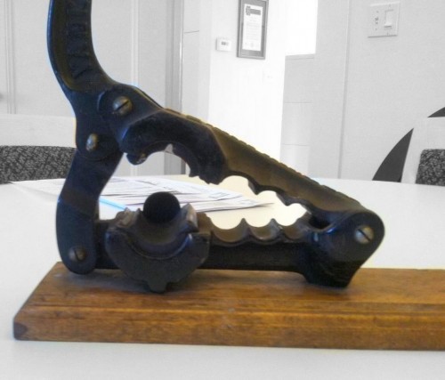 Update: the mystery object is a A Yankee Cork Press, for compressing corks to the proper size to fit into a bottle. Just a Guess? had the right answer before anyone else, and so wins a t-shirt from the NeatoShop! Kevin George had the funniest answer: "That's the famous scuplture "Desert Cowskull" by the steampunk impressionist Nemo Remington." That deserves a t-shirt, too! You can see the answers to all this week's mystery items at the What Is It? blog.