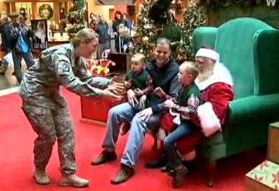 Four-year-old Dominic McCracken-Bruce and his 2-year-old brother Tyson only asked for one thing for Christmas -their Mommy. Army Reserve Capt. Dawn McCracken-Bruce was deployed to Iraq and Kuwait for the past nine months. When she came home for the holidays, she and her husband decided to surprise the boys during their visit with Santa Claus at the Mall at Robinson in Pittsburgh. See the video at WTAE. Link -via Fark