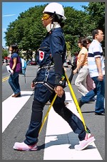 AGNES simulates a gerontological atmosphere in retail, public transportation, and workplace environments. Braces and bands mimic joint stiffness and muscular fatigue. Leg straps create slower leg movements, and helmet attachments give the wearer an age-induced curved spine. Yellow eyeglasses make it difficult to read small print, and earplugs simulate difficulty with sounds and tones.