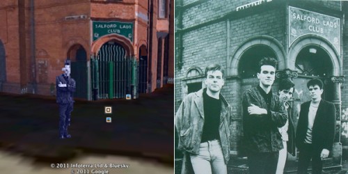 It was recently discovered that if you use Google Earth to view the Salford Lads Club in the UK you will find an image of the Mozster hanging out in front of the club, just like in this iconic photo of the Smiths from their The Queen Is Dead LP.