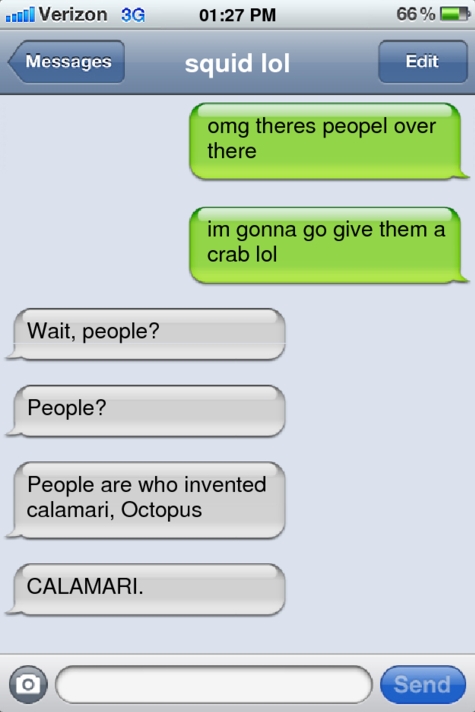 To get into this story, you first have to understand that octopuses tend to text their cephalopod friends while drunk. In a series of messages and photos, we follow the adventures of an octopus that steals a diver's camera (which you may recall actually happened) and then relates his activities to other octopuses, squids, and cuttlefish. You might recognize other true stories of cephalopods that are also referenced. Link -via Metafilter