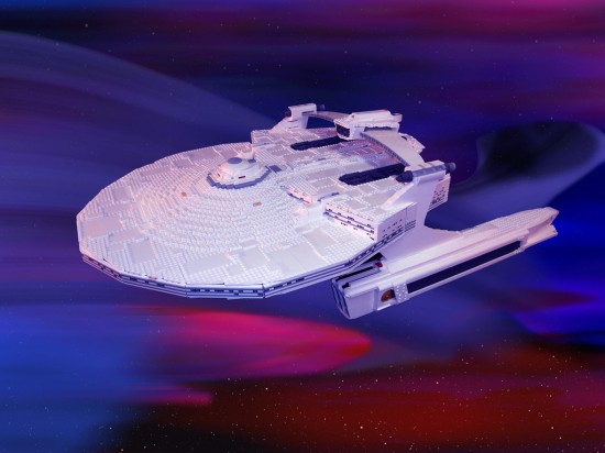 The redoubtable Miranda-class cruisers were in Starfleet service for a century and saw action from the Battle of the Mutara Nebula to the Battle of Cardassia. For us Trekkies, the most famous was the Reliant, which was hijacked by Khan Noonien Singh in the second Star Trek movie. Christer Nyberg made this LEGO model of it using about ten to fifteen thousand pieces. It's equipped with numerous lights, which you can see at the link.