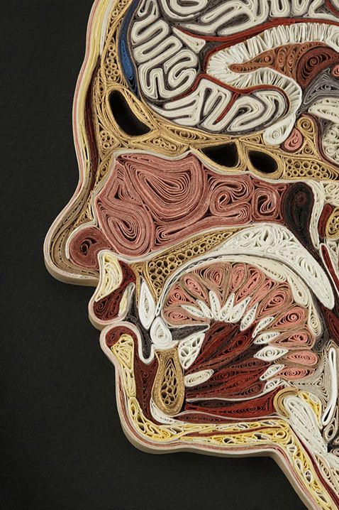 Lisa Nilsson used Japanese mulberry tree paper and gilt-edged paper from old books to recreate human anatomical images. It was clever of her to see a similarity between curled paper and human body tissues. View several more works at the link.