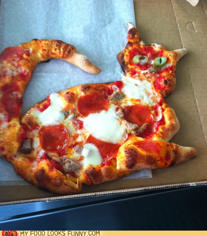 Sure he looks cute, but the toppings are far from evenly spread...and how on earth would you divide it up between your guests? Worst of all, it probably is covered in cat hair.