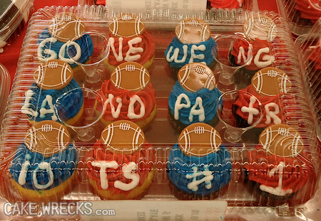 Jen Yates has a roundup of cake wrecks celebrating the Super Bowl. Can you decipher the message on these cupcakes?