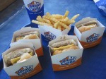 At the counter, Ms. Merritt ordered three cheeseburgers and the full complement of wines: four, in seven-ounce bottles. The burgers cost $2.49, the wine $18. A staffer carried the wine to a booth, twisted open the screw-tops and set out clear-plastic glasses. Table service enhances the ambience (and is required by state law).