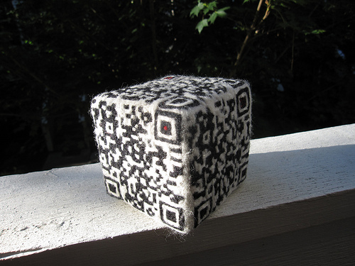 A needle felted die is pretty cool. One with QR codes is even better. But one on which each code represents a number of dice is totally neat-o-rama! Scanning a side of Shannon Henry's needle felted die pulls up Random.org's six-sided dice generator. The red pips tells you how many dice you're rolling, so you can roll up to six six-sided dice just by scanning the correct side.