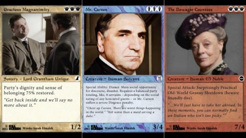 Downton Abbey Takes On Magic: The Gathering Writer Sarah Elmaleh created these great Downton Abbey Magic: The Gathering cards for your viewing pleasure. Unfortunately, she has not yet made enough to play an entire game out of.Link Via Kotaku Comments (4) Newest 4 Newest 4 Comments Downton, not Downtown. Abusive comment hidden. (Show it anyway.) What, it's not steampunk, too?I guess I'd have to be familiar with Downtown Whatsit and the Magic game to get this one. Abusive comment hidden. (Show it anyway.) Wow the creator of these clearly has never played Magic the Gathering and has no idea how the game works. #nerdrage Abusive comment hidden. (Show it anyway.) Great find, Jill.Here's a parody of Downton Abbey made by the BBC. Abusive comment hidden. (Show it anyway.) Login to comment. Click here to view up to the first 100 of this post's 4 comments