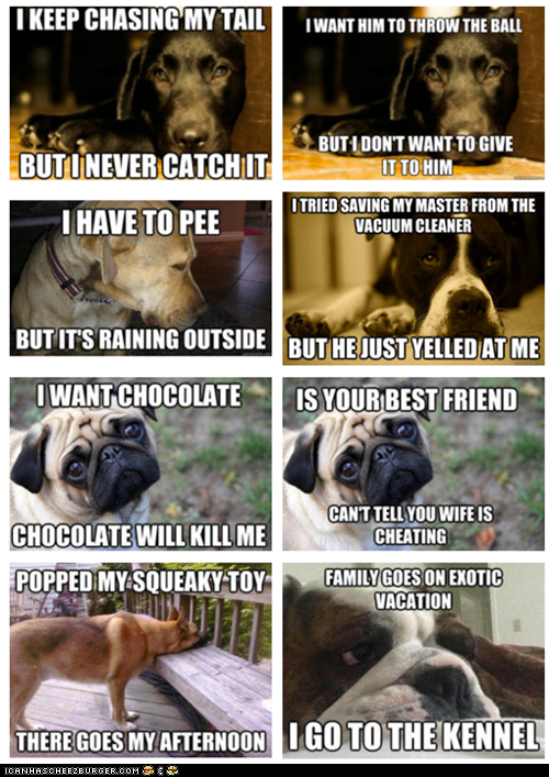 First World Dog Problems The first world problems meme might be a bit old right now, but first world dog problems is all new and seriously funny. Personally, I love the "I have to pee, but it's raining outside," as that's what my dog does all the time.Link Comments (3) Newest 3 Newest 3 Comments Ha! I made a facebook page for this a while back but it hasn't caught on yet! http://www.facebook.com/pages/First-World-Dog-Problems/295716640481902 Abusive comment hidden. (Show it anyway.) @JustinGHill - might have worked out better on tumblr... or perhaps that's my irrational hatred of facebook talking? Abusive comment hidden. (Show it anyway.) @ nauipyeah, i have never used tumblr for my own stuff.. I should probably give it a go at some point to expand my game a little more... Abusive comment hidden. (Show it anyway.) Login to comment. Click here to view up to the first 100 of this post's 3 comments