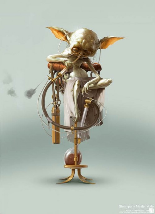 Björn Hurri used a series of illustrations to imagine Star Wars as a product of the 1870s instead of the 1970s. Here's Yoda in a hookah bar on Dagobah. At the link, you can find others showing Chewbacca, Han Solo, Princess Leia, C-3PO and more. Jabba the Hutt is shockingly human and naked.