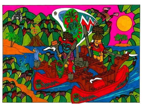 These paintings by Aurelie Montfrond are like visualizations of what goes on inside a child's mind as they play with their LEGO sets, the figures embarking on a grand adventure both simple in scope and brilliantly colored.