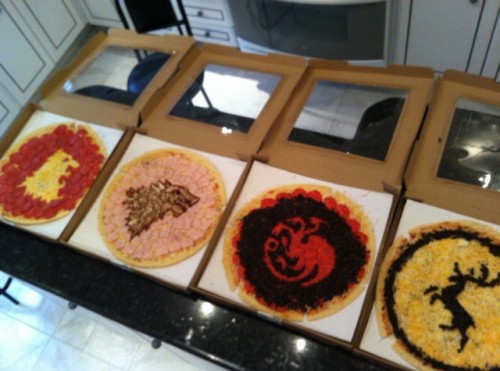 Just in time for the news that Game of Thrones was renewed for a third season, here's a delicious line up of pizzas proudly bearing the four crests of the four houses from the series. They look like mushrooms, olives, ham and peperoni...so they're almost certainly as tasty as they are awesome.