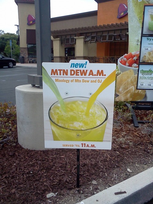 How do you turn Mountain Dew into a morning beverage? Just add orange juice, of course. While Taco Bell is calling their creation Mountain Dew A.M., I prefer Dewmosa or Dewdriver.