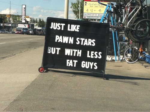 A sign spotted outside a pawn shop. Apparently, not everyone in the pawn business is eating that well. Yes, I know, it should be "fewer" fat guys. Link