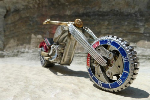 Ever feel like your life just keeps ticking away? Well, maybe it would help if you broke your watch and turned it into a mini motorcycle. Sure, it sounds like a tiny midlife crisis, but if your results are anything like Toronto-based sculptor Dan Tanenbaum's watch part bikes, then at least you've done something more productive than just buying an overpriced sports car.