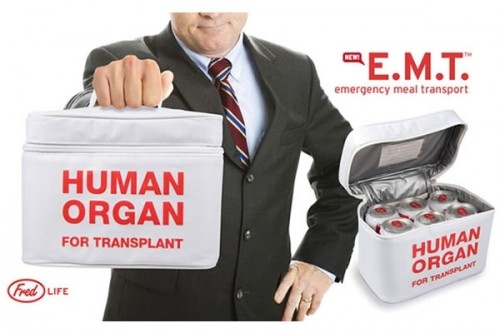 Here's a guaranteed conversation-starter for back to school! The E.M.T. insulated tote and lunch bag will keep sandwich and drink perfectly chilled, ready to transplant right into your waiting stomach. The Emergency Meal Transport is labeled "Human Organ for Transplant," but you can explain that away. The tote is insulated, with a zipper closure and a side mesh pocket, and there's a place to slip your name tag or business card into. Get yours today at the NeatoShop!Note: not to be used for human organs.