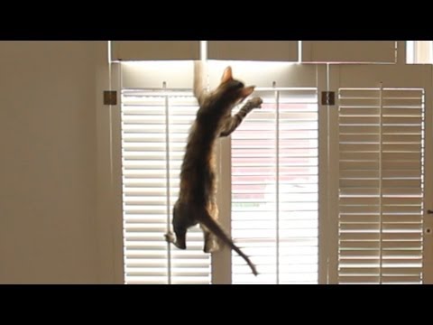 Hyder the kitten goes the extra mile to retrieve her favorite toy. She didn't break any of the blinds -this time. This game night not be so entertaining when she reaches her full size. -via Everlasting Blort