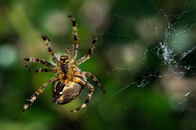 The thing I always wondered about was how a spider physically gets from several bushes and trees to create the main 6 or 7 support cables that form the basis of the circular web. To me that's more remarkable than the web itself.