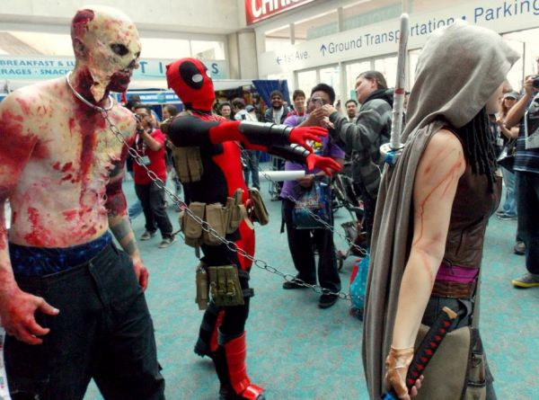 Part of the appeal of Dead Pool costumes is the fact that the people in them always seem to have fun and people always want to hang out with them, whether that means turning Deadpool into a walker...