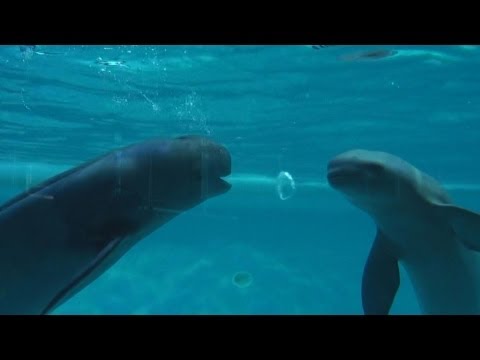 This is so cute! Porpoises at the Fukuoka Aquarium in Japan suck on an airtube, then blow bubbles. Watch them bounce the bubbles on their beaks like they're playing with a ball.