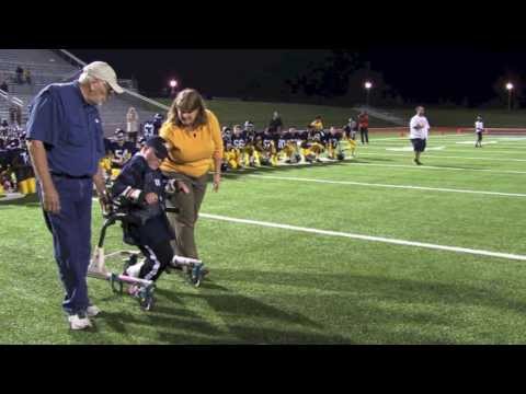 Tyler Bain, a 7th grade student at Pine Tree Junior High School in Longview, Texas, was injured in a car wreck and has been confined to a wheelchair for ten years. He's a big football fan and is the manager of his school's 7th grade team, the Pine Tree Pirates. A month ago, he made the decision that he was going to walk in public for the first time at their final home game. When he told coach Paul Ellsworth his plan, the coach made him honorary team captain for the occasion.