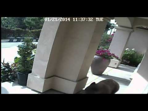 Bob and Irene McKeown of Scotland were visiting relatives in Pasadena, California, when they encountered more of American nature than they bargained for. The two left the house and locked the door behind them, but did not see the bear on the porch! It followed them to the car. That's what you see in this security video. Then Bob comes running back, trying frantically to get into the house. Where's Irene?