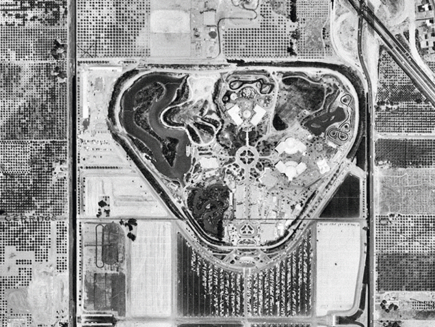 Disneyland opened in 1955 on the outskirts of Los Angeles, an island of fantasy in the middle of endless orange groves. Then the city grew up around it. Today it is a constrained island of fantasy in the middle of the city. The black and white image was taken on opening day, and the other is an aerial view from 2014. At Southland, you can read about the changes and see another gif comparing the park with a wider area around it from 1965 and 2014.