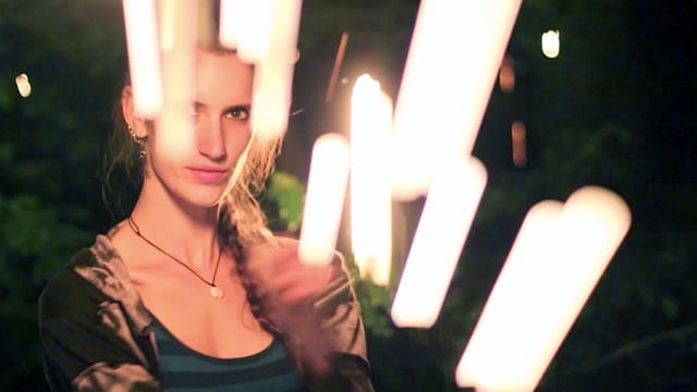 Bethan Ellerton is spinning balls of flaming steel wool. The sequence is running backwards so that the sparks seem to be flying at her instead of away from her. Don’t try this at home; she’s a professional. Richie Johnstonline filmed this sequence as an ad for Cascade Juggling, a juggling and circus equipment supplier. Johnstonline says,