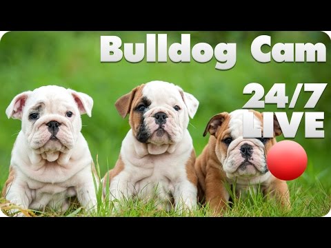 The Pet Collective presents an English bulldog cam, streaming live video of a litter of Minnesota-born English bulldog puppies and their tired looking, frequently nursing mama. There are five girls and two boys. The girls are Rainy, Glaze, Sandy, Stormy and Haily. The boys are Muggy and Fog. Few things are as predictably roly poly and sleepy.