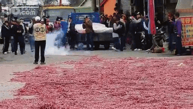 In the village of Nanwan, Guandong province, China, local residents annually detonate a pile of firecrackers spread over an open street. This is part of a ceremony in which a local god is removed from a temple and paraded through the streets in order to bring good fortune for the next year.