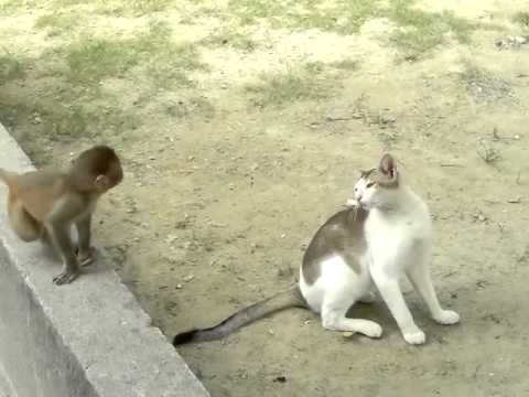 This darling baby monkey just wants a playmate and has settled on this cat... or is he purposely trying to annoy the cat? Perhaps a little of both. Regardless, their swing, push and pull routine is entertaining to see. Via Arbroath
