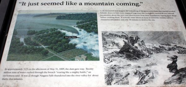 At 3:15 PM, the 72' high and 931' long earthen dam on South Fork Creek, holding back 20 million tons of water (about 5 billion gallons) in the 60-70' deep and two-mile long Conemaugh Lake failed, opening a 270-foot wide breach. The lake emptied out within 45 minutes and the resulting cataract of water cascading down the valley was no less than 30' at times and upward of 90', averaging 40 miles per hour as it destroyed practically everything in its path, including the towns of South Fork, Mineral Point, East Conemaugh, and Woodvale, all located upriver of Johnstown.