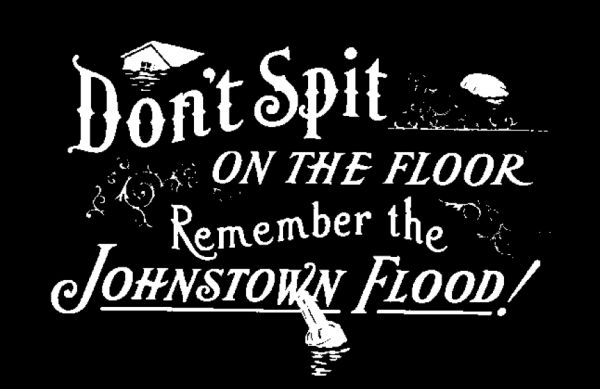 And in a scene found in the 1931 film Public Enemy, purported to take place in 1909, there is a sign on a wall that states, "Don't Spit ON THE FLOOR Remember the JOHNSTOWN FLOOD!" This sign or facsimile was typically employed in early 20th century restaurants, businesses, and movie theaters, on the silver screen during intermission in theaters and on the walls in other venues, as a gentle reminder in an age when many men chewed tobacco and would spit the results indiscriminately. (A similar reminder of the period was, ‘Do not expect to rate as a gentleman if you expectorate on the floor.’) But what exactly was this ‘Johnstown Flood’ in which there was such interest, especially in films, and why and how did it become such a cultural phenomenon?