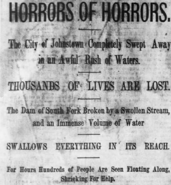 Beginning in June 1889, the ‘Johnstown Flood’ entered into American popular culture and stayed there for a couple of generations. The Victorian sentimental approach was used in the first books about the Johnstown Flood, which were full of horrendous eyewitness and survivors’ accounts, all heavy on the pathos. The first book about the flood appeared on June 6, only a week after the disaster, and many more were subsequently rushed into print due to the high demand. These were even sold door-to-door across the United States. There was also poetry composed about the flood (All the horrors that Hell could wish, such was the price that was paid for – fish) and photographs of the flood’s destruction were sold commercially.