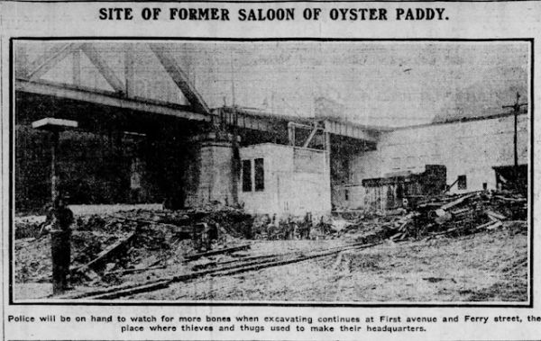 On the morning of Friday, June 22, 1906, workmen employed by Howard Bros. Contractors were excavating a foundation for a new skyscraper when they uncovered a pair of human skeletons two feet beneath the kitchen of a derelict building which had once been Oyster Paddy's Tavern. The initial supposition was that the workers had uncovered the remains of two Indians, but anyone who was old enough to remember the saloon-- and its infamous patrons-- during its heyday prior to the passage of the Brooks License Law of 1887 were highly skeptical of this explanation.