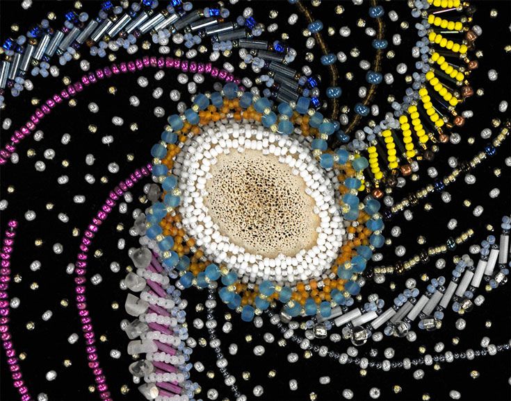She remembers the day, over a decade ago, when her partner, Bob Mumford, showed her some Hubble Space Telescope images online. The swirling nebulae, star clusters, and galaxies reminded him of beadwork. Nazon agreed; she was particularly attracted to the whirl of colours and ocular shape of the Cat’s Eye Nebula. In the tradition that had characterized her beading experiences, she tried to create a precise replica of the image. This left her frustrated, and she eventually disassembled the piece.