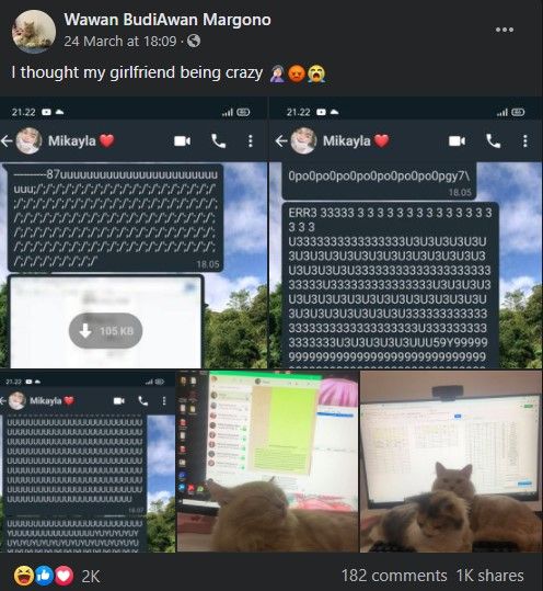When Wawan Margono suddenly received gibberish messages from his girlfriend Mikayla, he thought that she went crazy and immediately checked up on her inside her room. But upon entering the room, what welcomed Wawan was not her girlfriend, but their cats who were sitting down on the keyboard of Mikayla’s laptop.