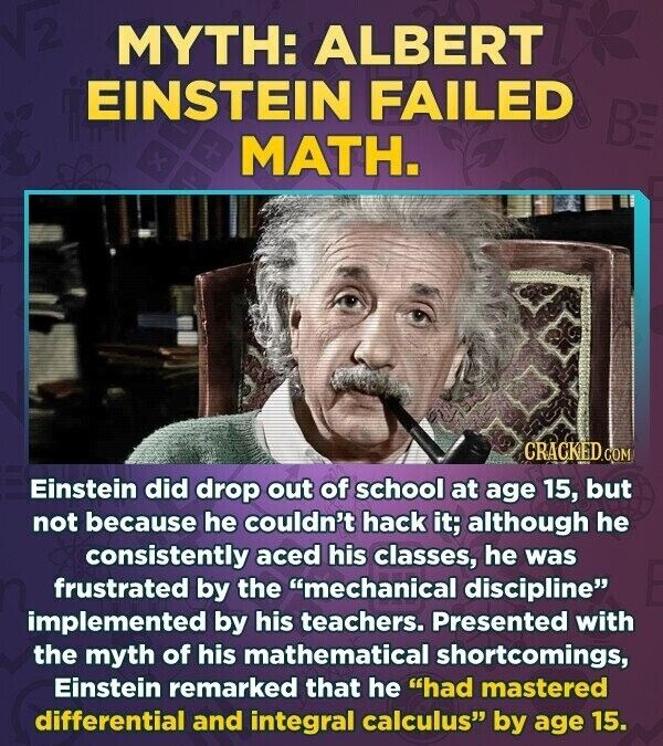It's become common for parents to console children about bad grades by comparing them to Einstein, saying he got bad grades, and look how he ended up. Then the child drops out of school and tells his parents, well, Einstein dropped out, too, and look how he ended up. The myth about bad grades came from a misunderstanding of how numeric grades in Switzerland (and later Italy) worked. Einstein was brilliant in science and math, and okay in other subjects. He just hated school because it was regimented and boring. He did drop out of school at 15, because he wanted to join his parents who were living in Italy. Einstein went on to get a PhD in Zurich.