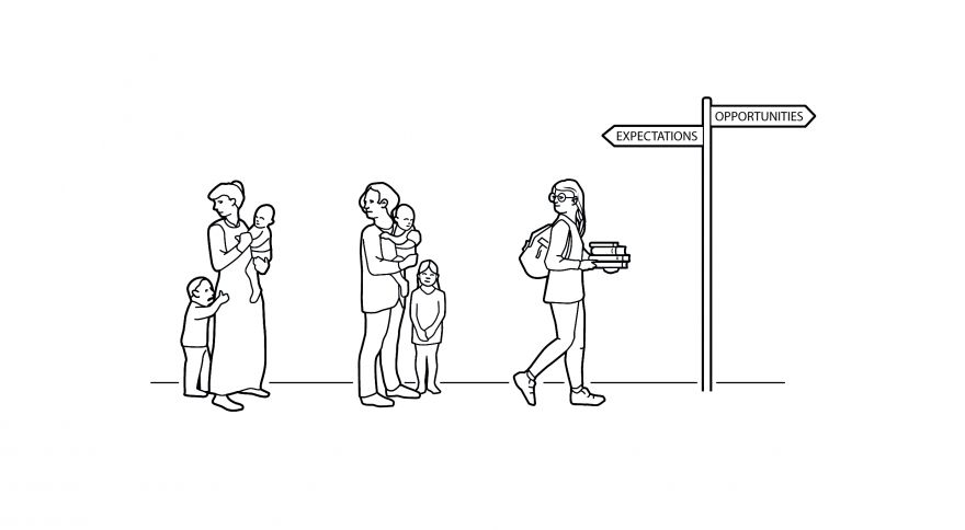 One example is the illustration above, which depicts the research done by Claudia Goldin on the understanding of women's labor market outcomes. It's an incredibly simple illustration showing three generations of women looking back toward their mothers, with the first two having their children in tow, and the last one carrying books and a backpack. A signpost at the right end shows two opposite directions saying "expectations" and "opportunities". It's simple yet powerfully communicates a part of Goldin's research. Jarnestad also made three other illustrations of Goldin's research which you may check out on Fast Company.
