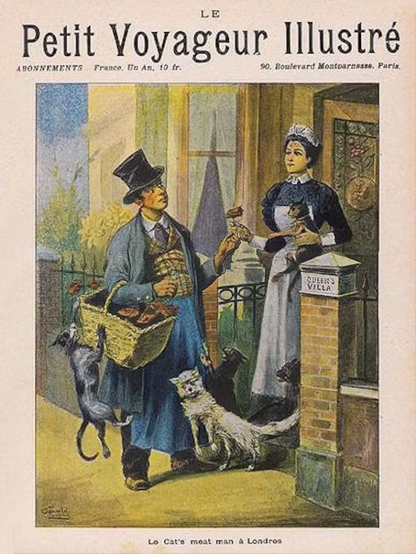 Among the many occupations of the Victoria era that no longer exist, you can count the cat's meat man. These were vendors who went from house to house selling fresh meat for cats and dogs. Dogs had always been both working and companion animals, but cats were rising in popularity among city dwellers as members of the family as well as pest control experts, and those who loved them were willing to buy meat for them. These vendors sold horse meat as well as organ meat and other castoff pieces from beef and pork slaughterhouses. In the mid-19th century, there were a thousand cat's meat men in London serving some 300,000 cats, and quite a few dogs as well.