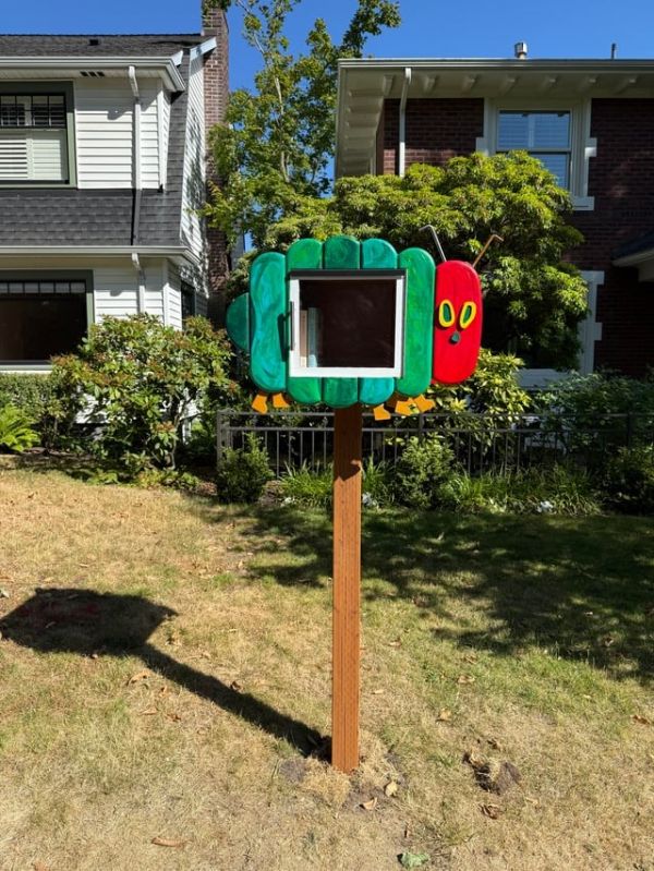 The design is from Eric Carle's classic picture book The Very Hungry Caterpillar. What happens to this caterpillar? In the light of the moon, a little egg lay on a leaf. When he hatched, he started looking for some books to read. With each passing day for a full week, he found more and more books to read at his local Little Free Library, which he devoured in his cocoon.