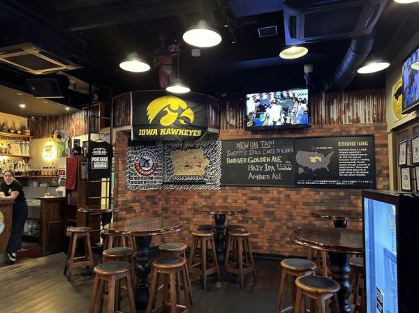 And the decor leans heavily into Americana--or at least what a modern American brewpub looks like. It looks like a very affectionate vision of the United States, not a parody. The restaurant celebrates the heartland state of Iowa in particular and the University of Iowa Hawkeyes are favored.