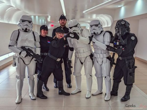 You can't be too cold when you're covered in pounds and pounds of rhinestones! You can get a closer look at Anne-Ma in her glittery gold glory in a video at Instagram. There were also a good number of group cosplayers arriving together or else getting together, like the cast of Teenage Mutant Ninja Turtles at the top, and a contingent of bad guys from the Empire below.