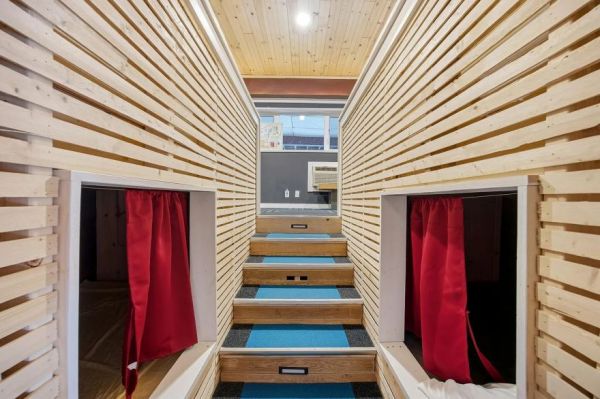 Every amenity of a modern home is available, including a terrifying-looking staircase, a complete kitchen, a walk-in shower, and diner-resembling seating.