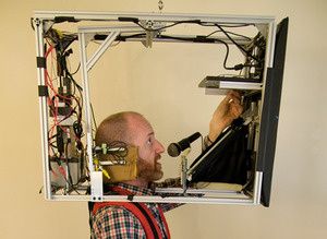 The rig is a head-mounted box with a 24-inch LCD monitor on the front that displays a larger-than-life version of Dan's face. Inside the box, Dan has a tiny camera trained on his face, a microphone, and a monitor connected to an external camera so he can see where he's going. To test gaze awareness, the rig is configured so that Dan is looking directly at you while talking to reduce the thousand-yard stare associated with teleconferencing.