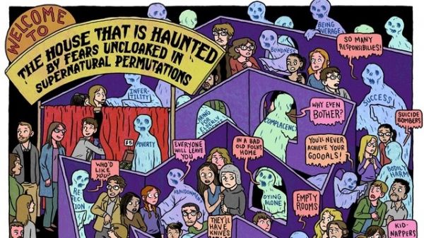 Her latest comic is called Scaredcited, and it's a delightfully illustrated exploration of what really scares us, under the guise of visiting a haunted house.