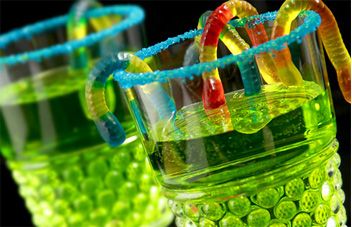 Quench your thirst after trick-or-treating with this recipe for bug juice, complete with blue bug goo rim and gummi worms to nibble on while you sip.