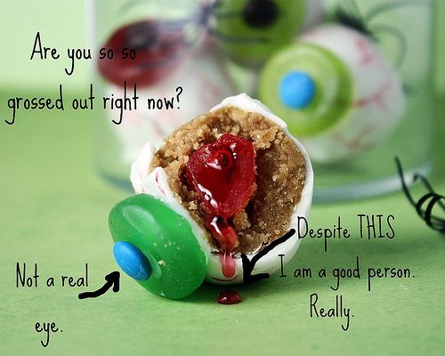 Now you too can follow the link below and learn how to make your own peanut butter eyeball truffles, with white chocolate frosting and an oozing cherry center just like a real eyeball...