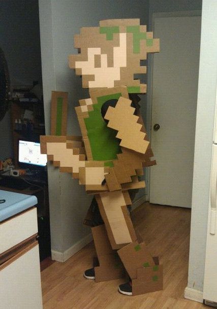 An 8 bit Link costumes sounds like a good idea, and making it out of cardboard even better, but here's the problem- if you don't walk around sideways all night everyone will think you're just some crazy guy with cardboard attached to their clothes!