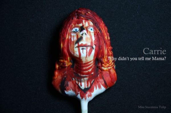 Miss Insomnia Tulip made cake pops that look like the female lead characters from Carrie, Misery, The Exorcist, and The Blair Witch Project. Awesome! This one is, of course, Carrie. See the rest at Eat Your Heart Out 2012. Link -via Boing Boing